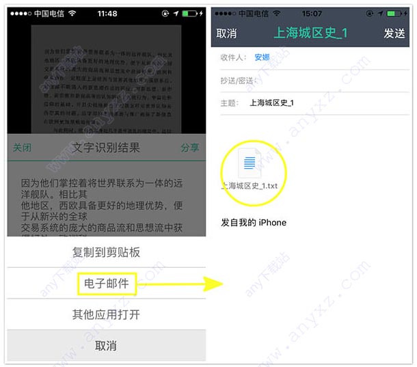 点击【电子邮件】或【其他应用打开】,即可将文字导出为 txt 文本,便于你发送邮件,或分享到微信、QQ等应用中。