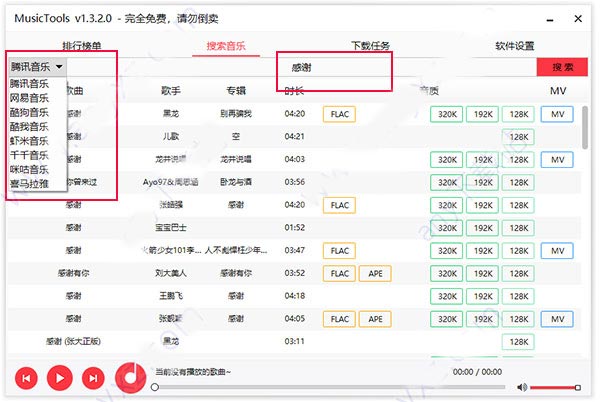 随着音乐版权越来越受到重视,在线听歌的限制也越来越大,国内大部分平台都推出了收费服务,已经无法随心所欲地下载歌曲。基于这种情况,博主为大家带来了musictools,这是一款完全免费的无损音乐下载器,支持腾讯音乐,网易音乐,酷狗音乐,酷我音乐,千千音乐等多个国内音乐站,可以免费解析下载歌曲文件,只需搜索歌曲名或歌手名,就可以找到相关的所有音乐。最主要的是:musictools支持下载无损音乐,完全不需要任何费用,内置了Aria2下载技术,下载速度非常快,将是你下载音乐的好帮手。