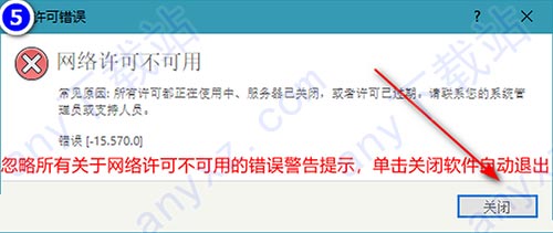 忽略所有关于网络许可不可用的错误警告提示,单击关闭软件自动退出!