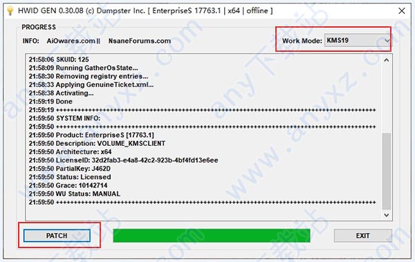 7、等待安装完成后,进入系统你会发现win10 ltsc 2019并没有激活,这时打开hwidgen激活软件,右上角选择kms19模式,再点击patch按纽;