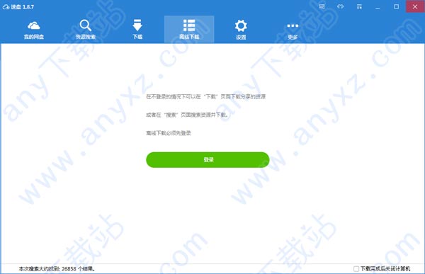 2、双击“SpeedPan.exe”打开speedpan速盘,用户在不登陆的情况下可以在下载页面下载分享的资源,也可以在搜索页面搜索资源并下载。